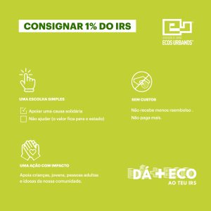 Ao destinar 1% do seu IRS já liquidado, aos Ecos Urbanos, não tem qualquer custo adicional para ti. Ao fazê-lo, estás a canalizar parte dos teus impostos para uma instituição à sua escolha.