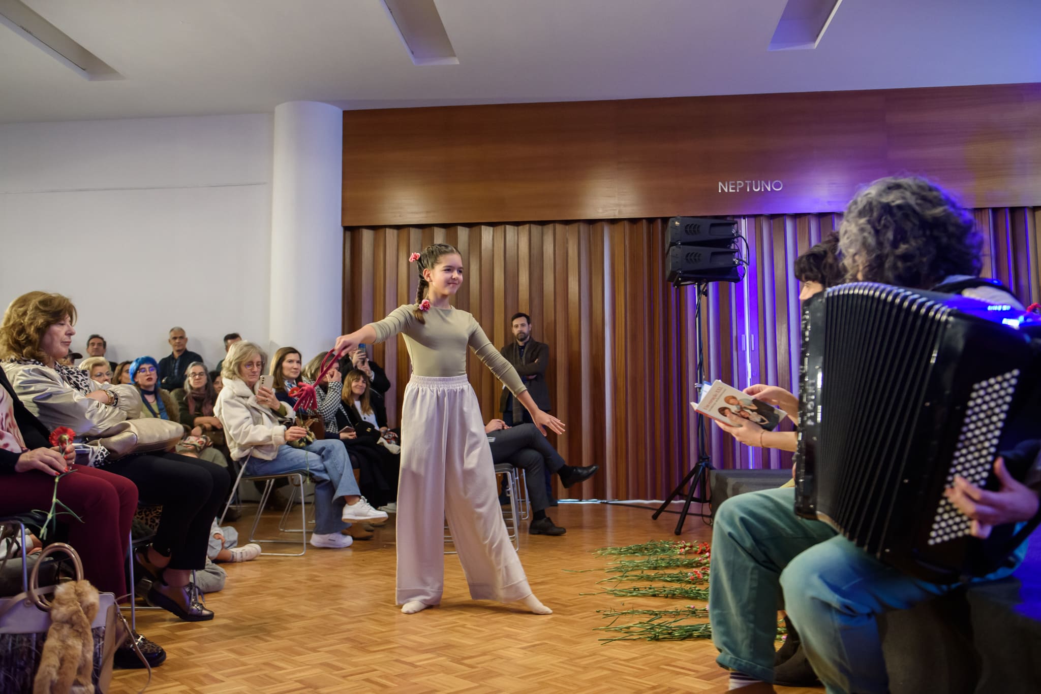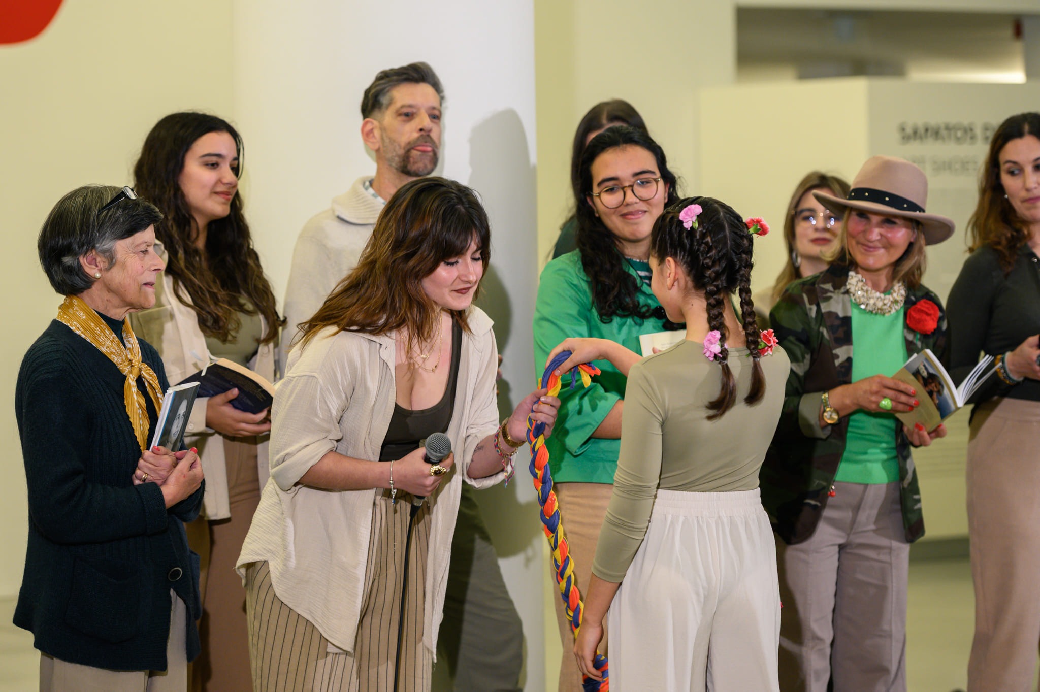 Acolhemos o público ao som do acordeão da Sónia Sobral, bastava seguir o som para encontrar o início da Peregrinação Poética. Fomos o palco 1 e também, guias do caminho entre os espaços do Museu do Calçado e a Torre da Oliva.