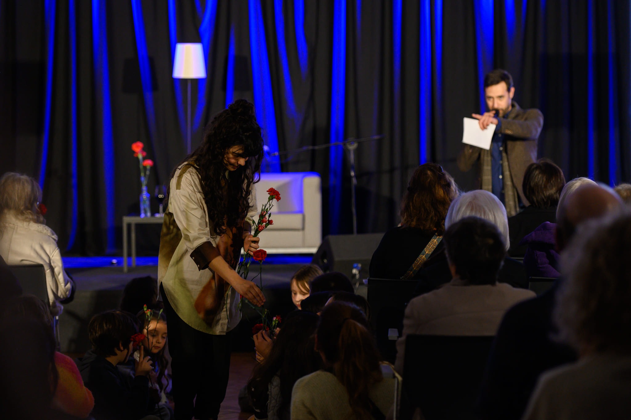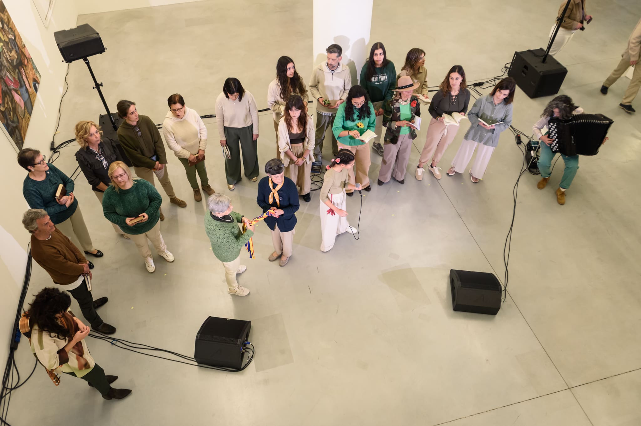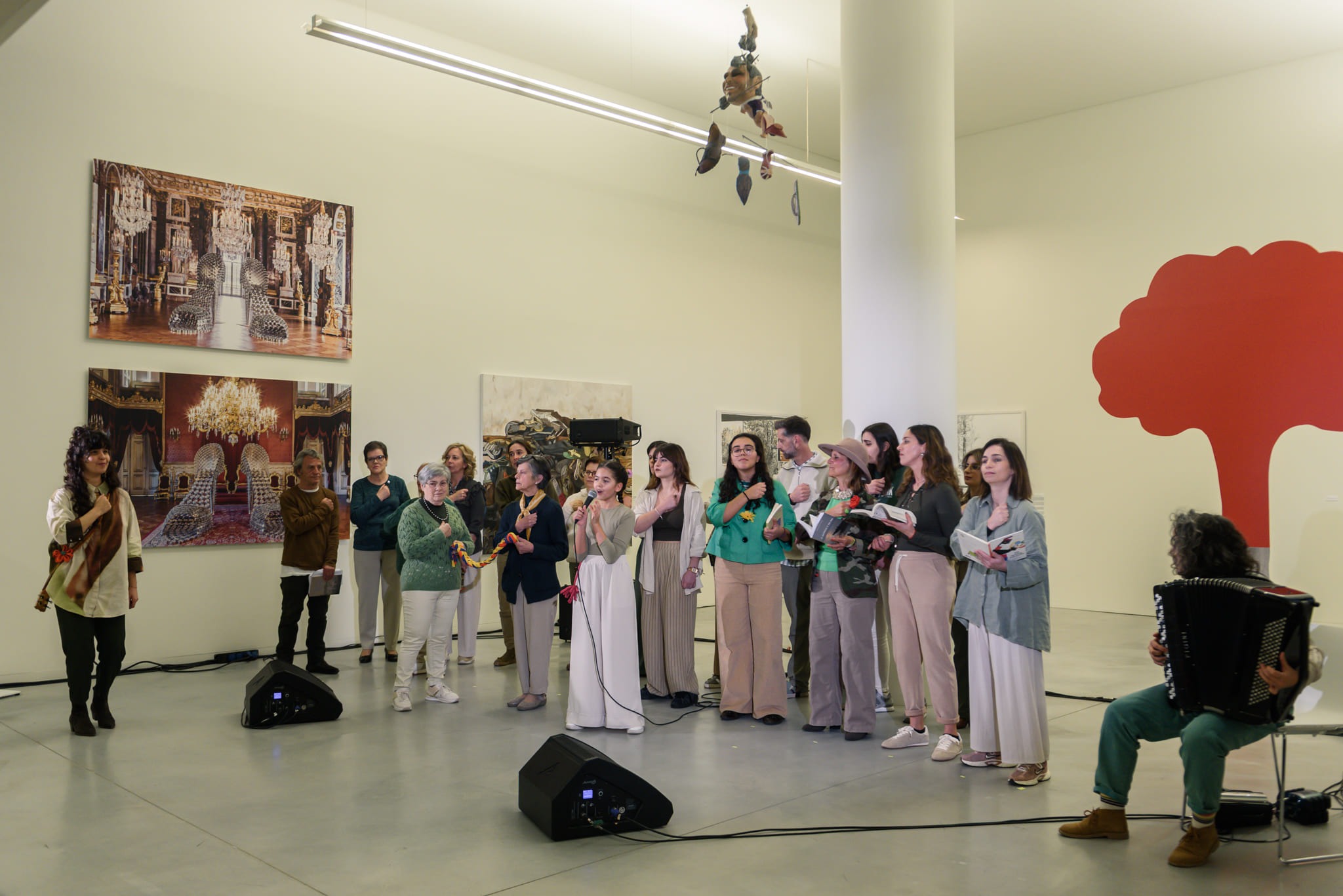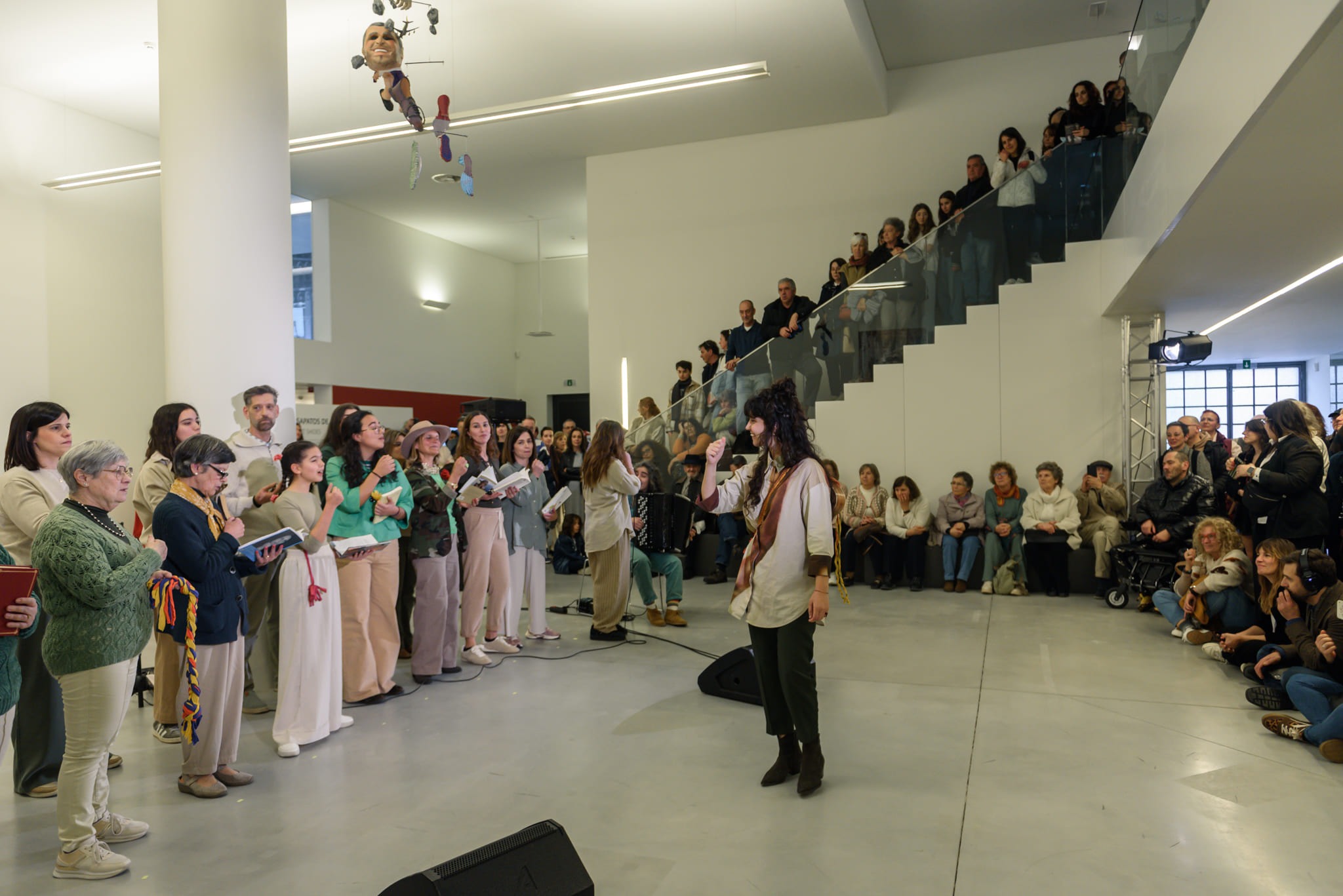 Abrimos com “Amargo Estilo Novo”, de António Gedeão, num solo da Beatriz Coutinho. Seguimos com “A Propósito das Estrelas”, de Adília Lopes. Depois, com “Calle Príncipe, 25”, de José Tolentino Mendonça, em cante alentejano, saímos de palco e formámos uma espiral musical ao longo das escadas até ao palco 2.